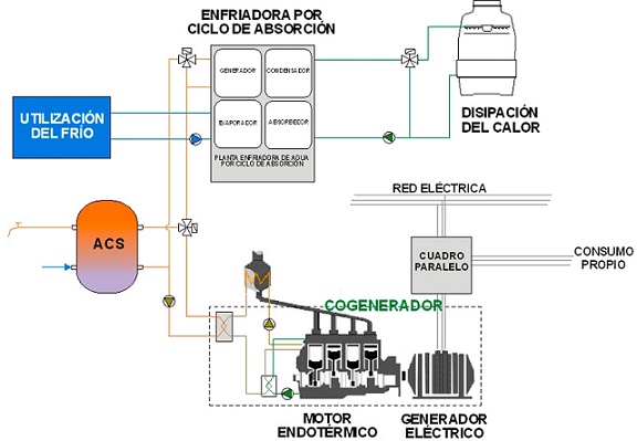 Un sistema de trigeneración se consigue al acoplar un sistema de cogeneración por motor térmico o por turbina, junto con una máquina de absorción destinada a refrigerar agua utilizando la energía térmica contenida en el agua de enfriamiento y/o los gases de escape del elemento motriz del alternador eléctrico.